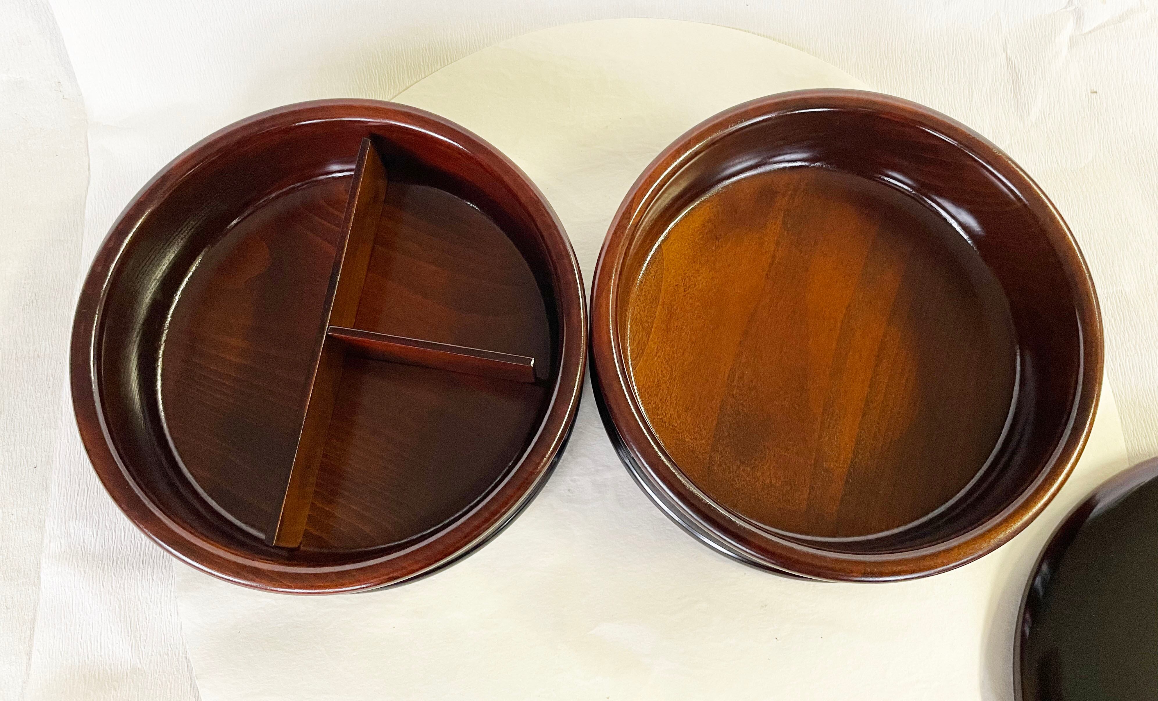国産 木製 重箱 おせち 本漆塗 つづみ型 春秋蒔絵 丸二段重 6寸 18cm 溜塗内すり漆 香川漆器 弁当箱 漆器